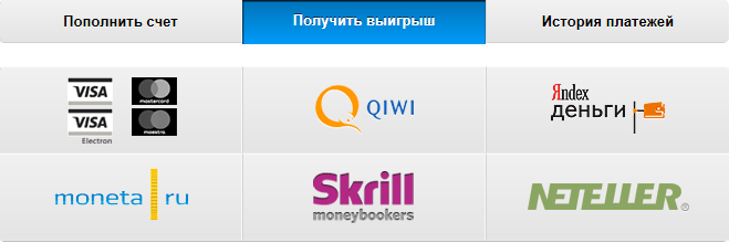 Наконец, есть и сам пункт «Касса», который отвечает за финансовые операции в покер-руме. Он имеет три вкладки: пополнить счет, получить выигрыш и история платежей.