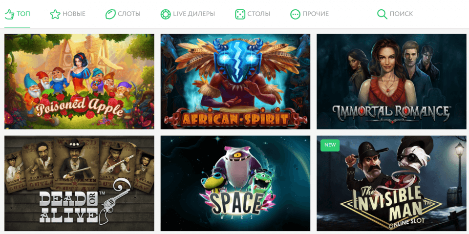 Главная страница представляет для себя ряд интуитивно понятных вкладок, а под ними – карточки с конкретными столами и играми. Первая вкладка называется «Топ» и включает самые популярные развлечения, куда может попасть абсолютно все что угодно.