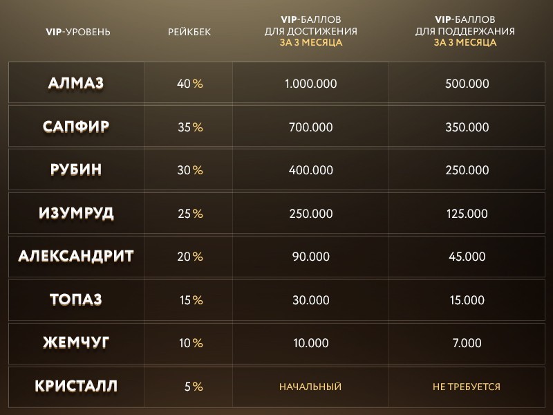 Если вы не успеваете набрать, то должны попытаться хотя бы сохранить уже имеющийся уровень. Во всех случаях, кроме Жемчуга и Рубина вам необходимо будет в два раза меньше VIP-баллов, набранных за период в три месяца, чтобы оставаться на том же уровне.